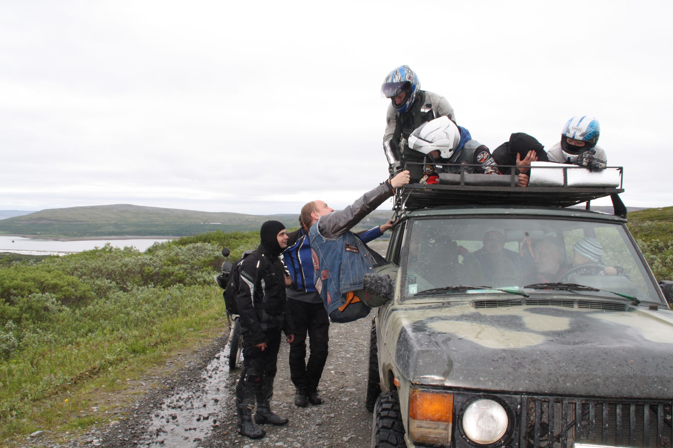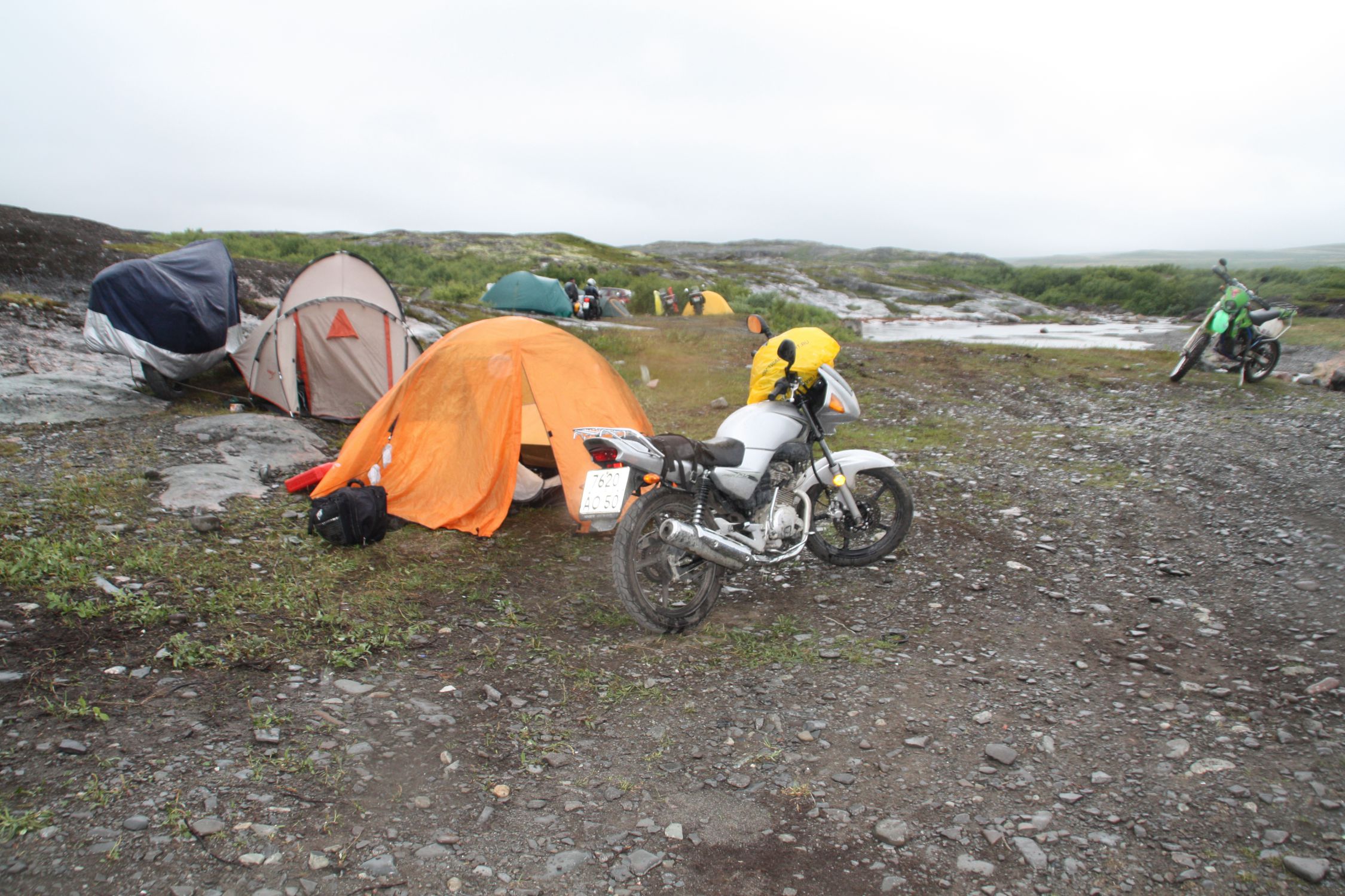 5 июля катаемся по Мурманску. Попадаем с финами )) на экскурсию на ледокол «Ленин» и потом едем на место слета. Сворачиваем с асфальта и 25 км плохой грунтовки с преодолением первой большой лужи в моем опыте. ))) На месте сбора мы ставим палатку не на пляже, а в кустах, так как дул ЛЕДЯНОЙ ветер, от которого плохо спасала наша полная экипировка с дождевиками. Сразу мысль, что отсюда надо валить )))