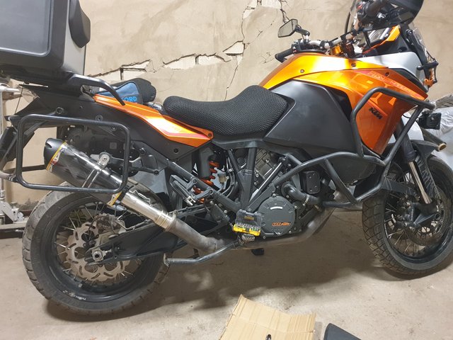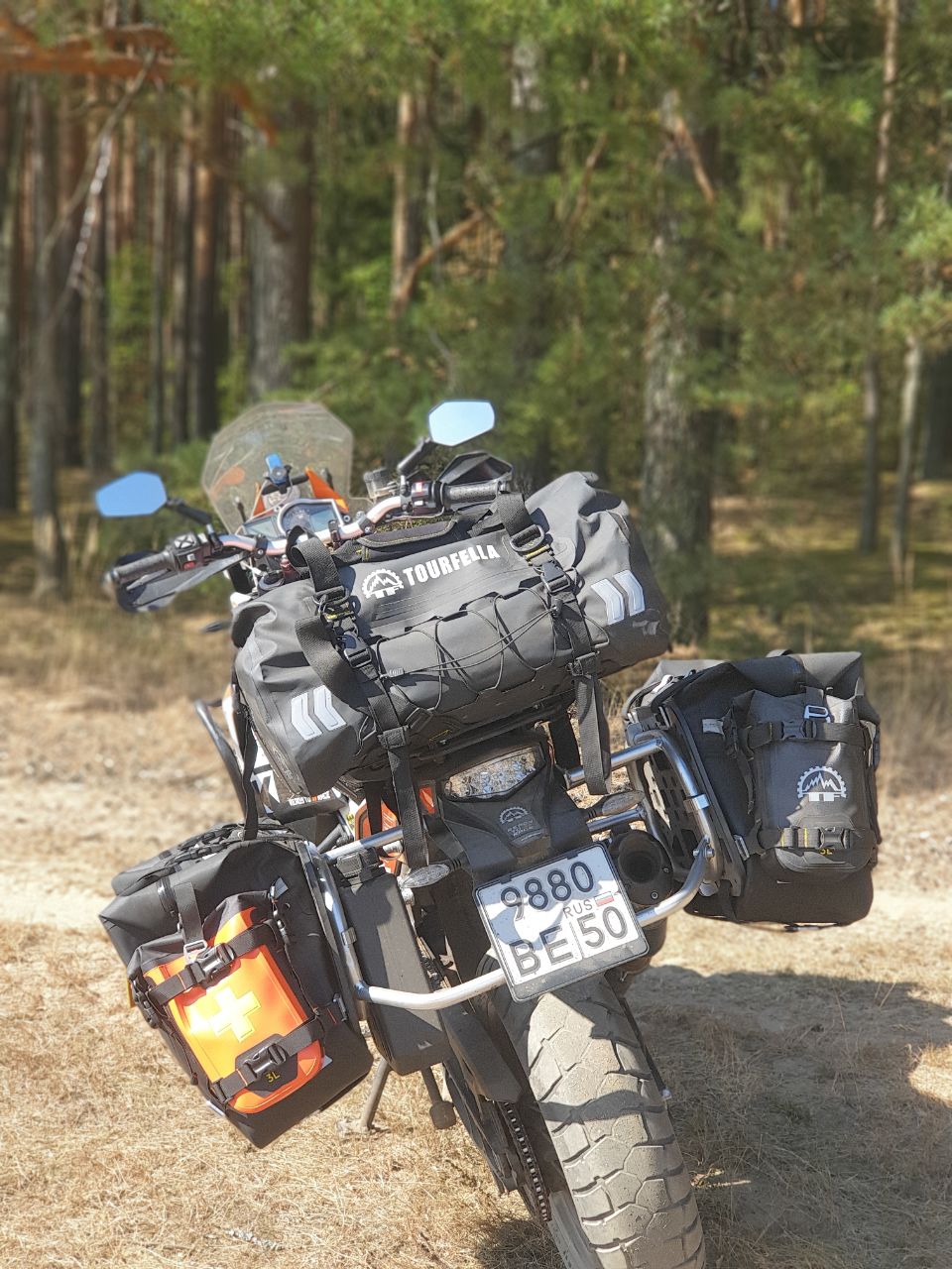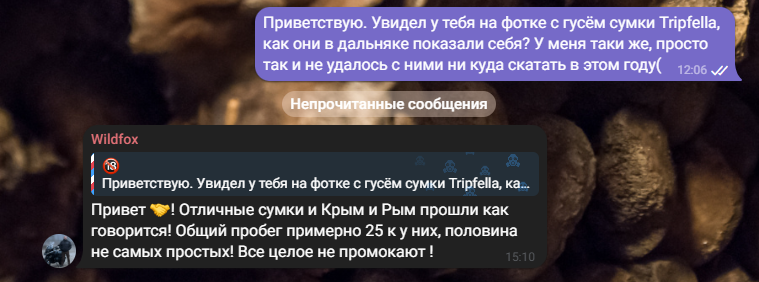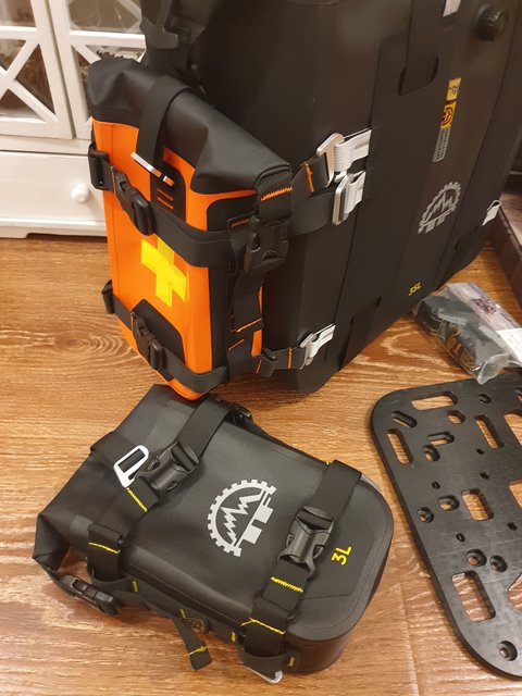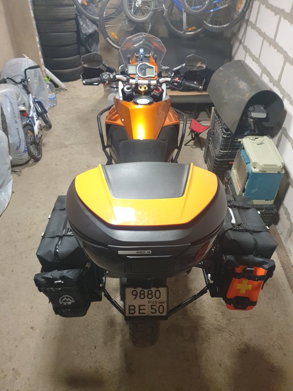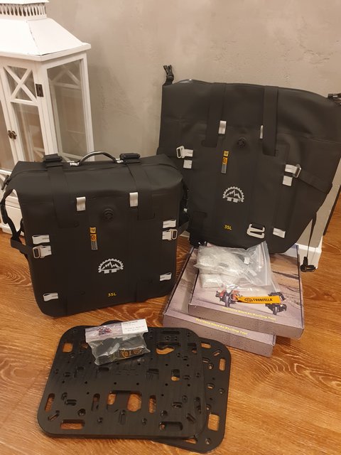 И так возвращаемся к нашим сумкам Tripfella. Решил я как-то промониторить маркетплейс и о чудо, нашёл их по скидке за 32.000р, единственный минус был в том, что это за комплект кособоких сумок 27L+ 35L. Такой вариант меня полностью не устраивает, мне нужны либо 27L+ 27L, либо 35L+ 35L тк хочу что б было симметрично (для этого правда придётся переделать рамки и поменять огромный глушак на что-то компактное и с прямым выхлопом) Нашёл в интернете магазин, который выставляется на Wildberries, им оказался Moto-Scout. Владельцем является Иван, он так же состоит в чатке KTM. Созвонился с ним, он мне рассказал про все технологии и плюсы этого производителя, который кстати даёт гарантию на 5 лет (фурнитура, соединения и др), понятное дело что при правильном использовании. Выкупил я сумки на Wb 27L+ 35L pf 32.000р, потом встретился с Иваном и он мне ону 27L поменял на 35L. В комплекте уже есть всё необходимое для установки и даже пластина, на которую вешается сумка. Пока проводились данные манипуляции, сезон незаметно подошёл к концу и протестить мне их так и неудалось. Остаётся только любоваться ими в гараже. По первому впечатлению сумки действительно кажутся качественными, материал довольно таки толстый. Для придания формы, внутри прокладывается вкладыш. Так же я решил их доукомплектовать навеской по 3L каждой и вместо центрального кофра взял баул на 50L для дальняков. Они кстати идут с подворомом и на липучке. В итоге получился полный комплект, осталось только дождаться нового сезона и по полной их затестить